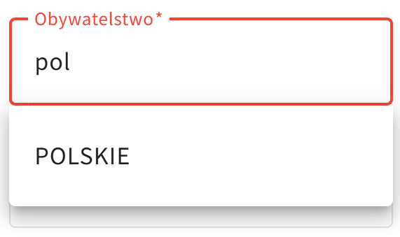 - Niektóre pola wymagają wprowadzenia minimalnie trzech znaków w celu wyszukania opcji do wyboru - na przykład pole "Obywatelstwo", krok 1 Dane osobowe: